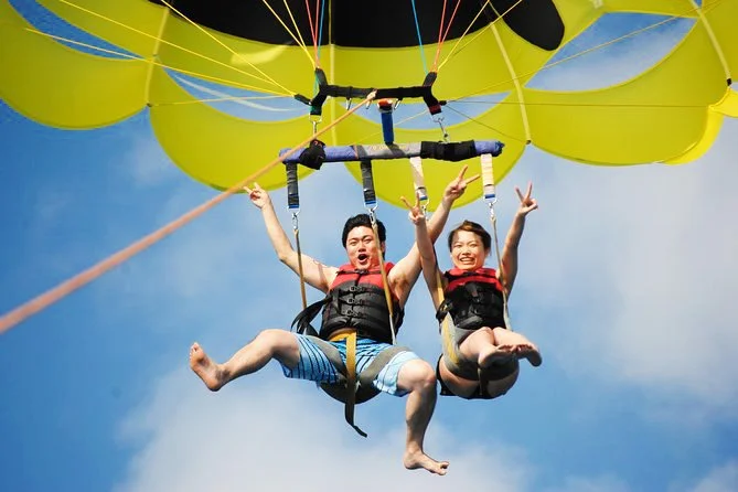 Soar above the sparkling Hawaiian waters on an unforgettable parasailing adventure. Feel the exhilaration as you're gently lifted into the air, gliding effortlessly with panoramic views of the islands' stunning coastline. Perfect for thrill-seekers and nature lovers alike, this activity combines adrenaline-pumping fun with the serene beauty of Hawaii's tropical paradise.